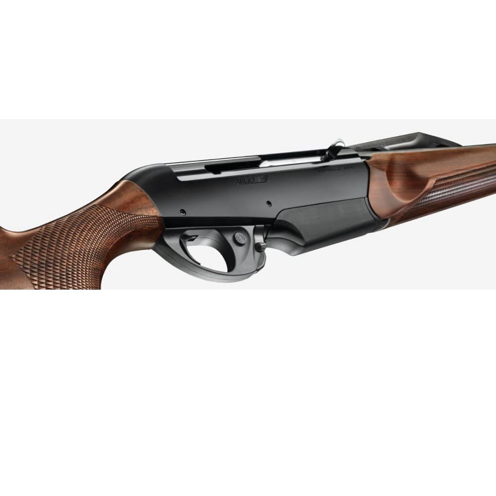 Su configuración Base apuesta por una culata de madera de nogal con picado antideslizante, combinando estética clásica con ergonomía funcional. El conjunto destaca por su equilibrio, facilidad de manejo y capacidad de repetir disparos con rapidez y seguridad, convirtiéndolo en una opción muy valorada por cazadores tradicionales que buscan tecnología probada.